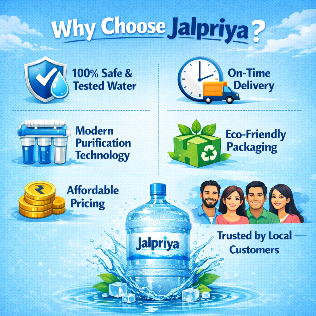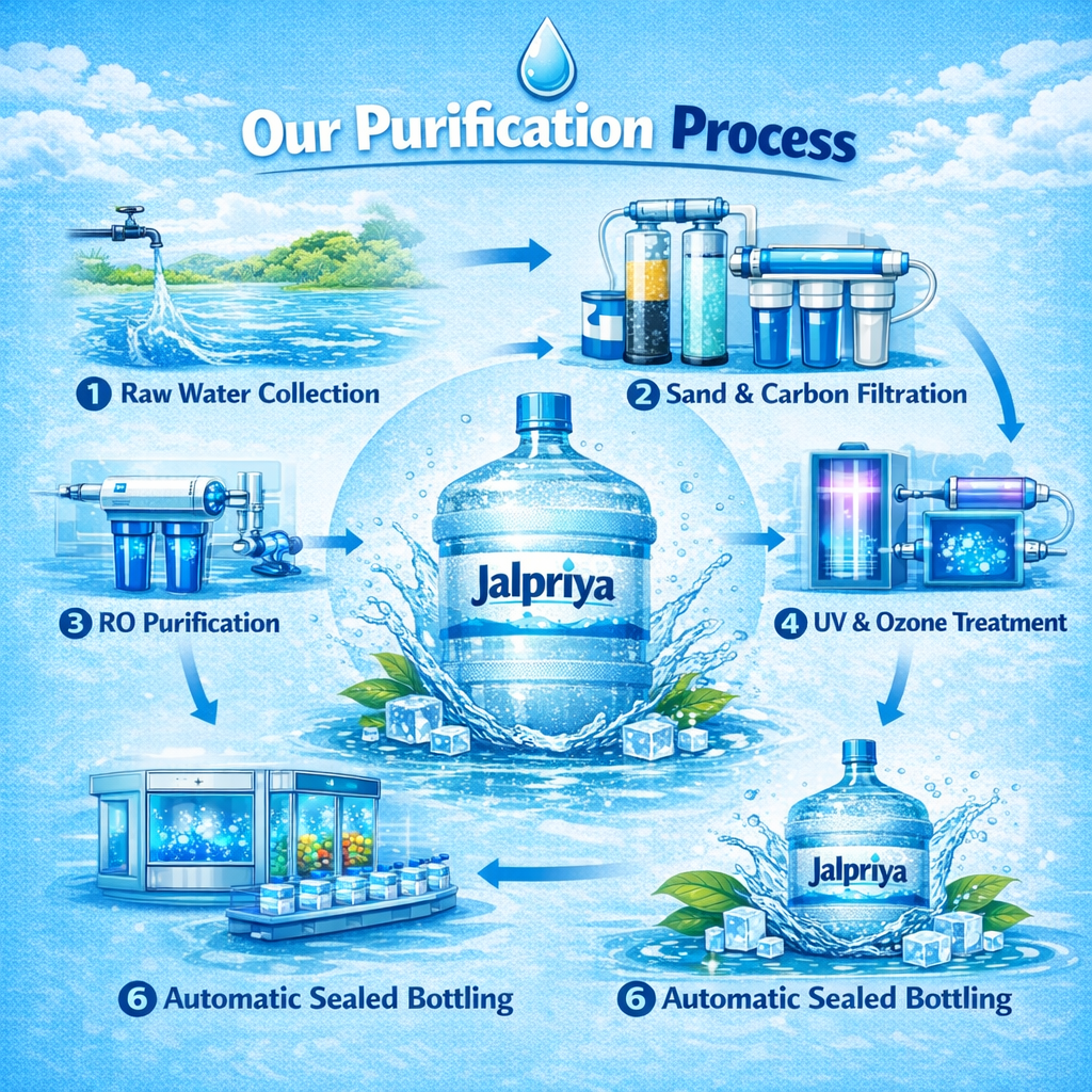 Jalpriya is committed to delivering crystal-clear, mineral-rich drinking water that keeps you hydrated and healthy. Our water goes through advanced multi-stage purification and quality testing to ensure every drop is safe, fresh, and refreshing.
